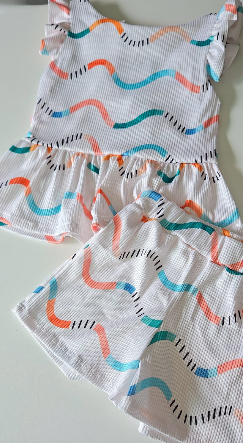 A blusinha tem babadinhos delicados nos ombros e uma barra peplum, trazendo aquele toque fofo que as mamães amam. O short combina perfeitamente com a estampa moderna e colorida, deixando o visual alegre e divertido.