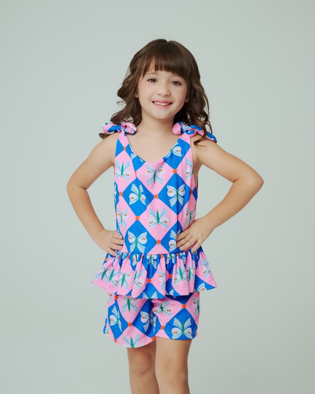 Feito em malha canelada leve e confortável, o conjunto é perfeito para acompanhar as pequenas em todas as suas aventuras.