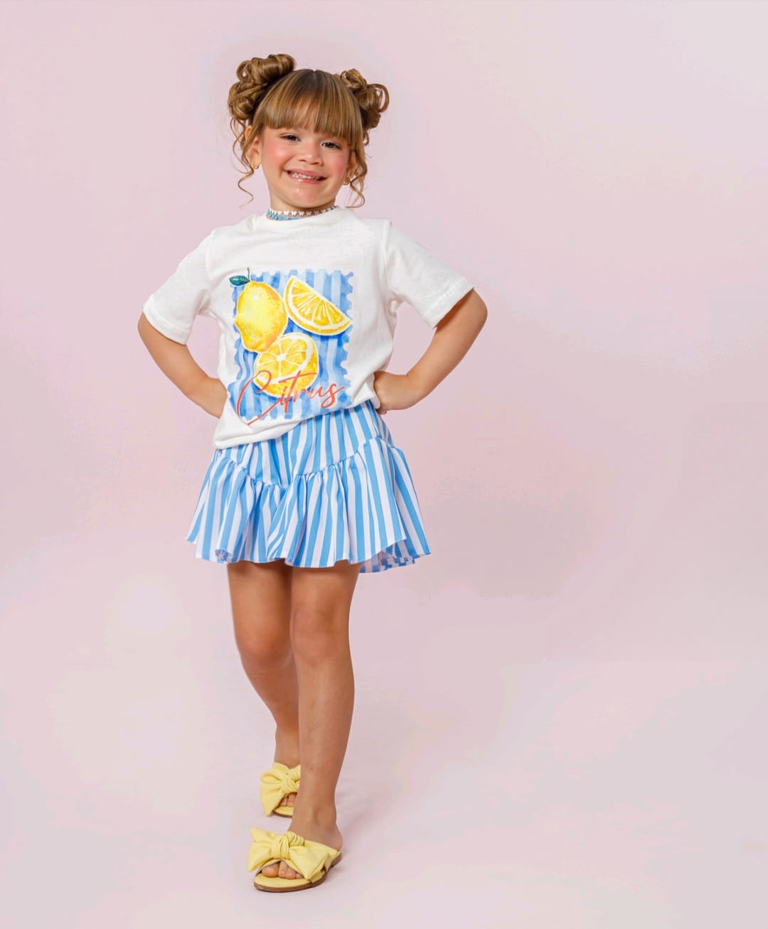 A blusa em algodão é macia e confortável, com estampa divertida de limões que traz um toque moderno e delicado ao look.
