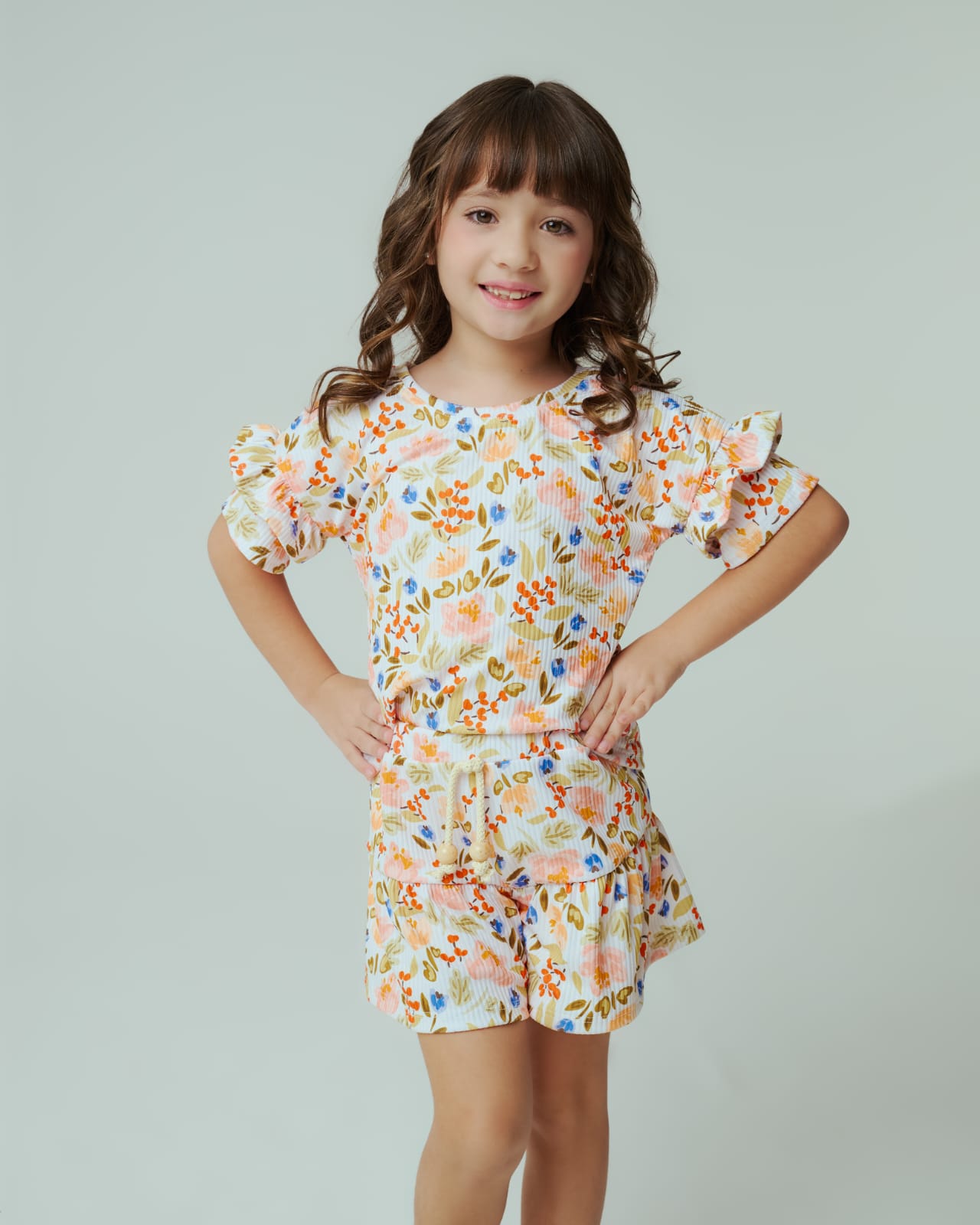 A estampa floral delicada traz um toque de alegria e leveza, enquanto as mangas com babadinhos e o short com cordinha completam o visual com muito estilo.