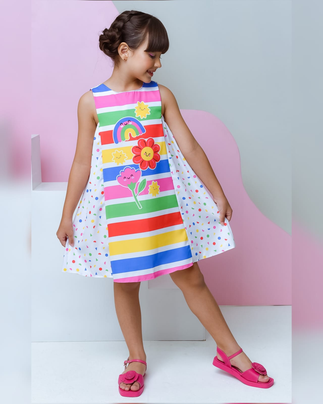 Este vestido colorido é perfeito para um dia cheio de aventuras no shopping garantindo conforto e estilo para um passeio em família. O look ideal para deixar vovó e vovô encantados em uma visita! Quando é hora de brilhar na festa de aniversário, esta escolha vibrante é certeira.