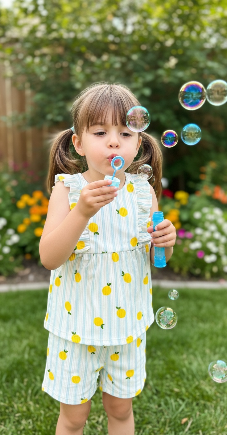 Com estampa de limõezinhos amarelos e listras em tom azul suave, ele traz o frescor do verão em cada detalhe. Confeccionado em malha canelada leve e confortável, o modelo garante liberdade para brincar e se movimentar o dia todo.