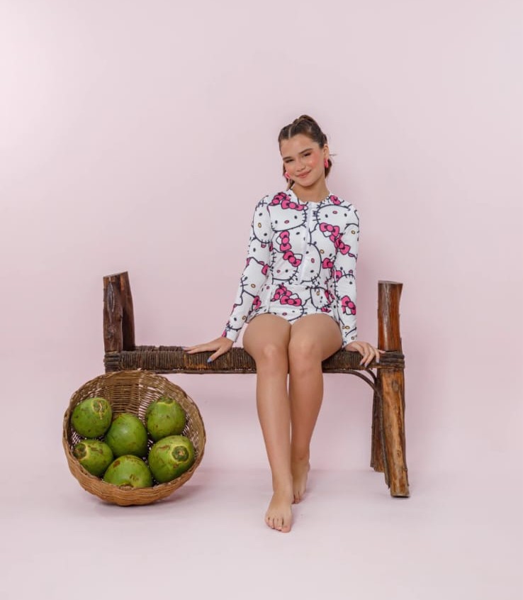 Estampa divertida da Hello Kitty que agrada as crianças O maiô conta com tecido macio e confortável, perfeito para a pele sensível dos bebês. A manga longa garante mais proteção contra os raios solares e o zíper frontal ajuda na praticidade para os pais durante o uso. O visual com estampa da Hello Kitty traz um toque fofo e divertido para as roupas de praia infantis.