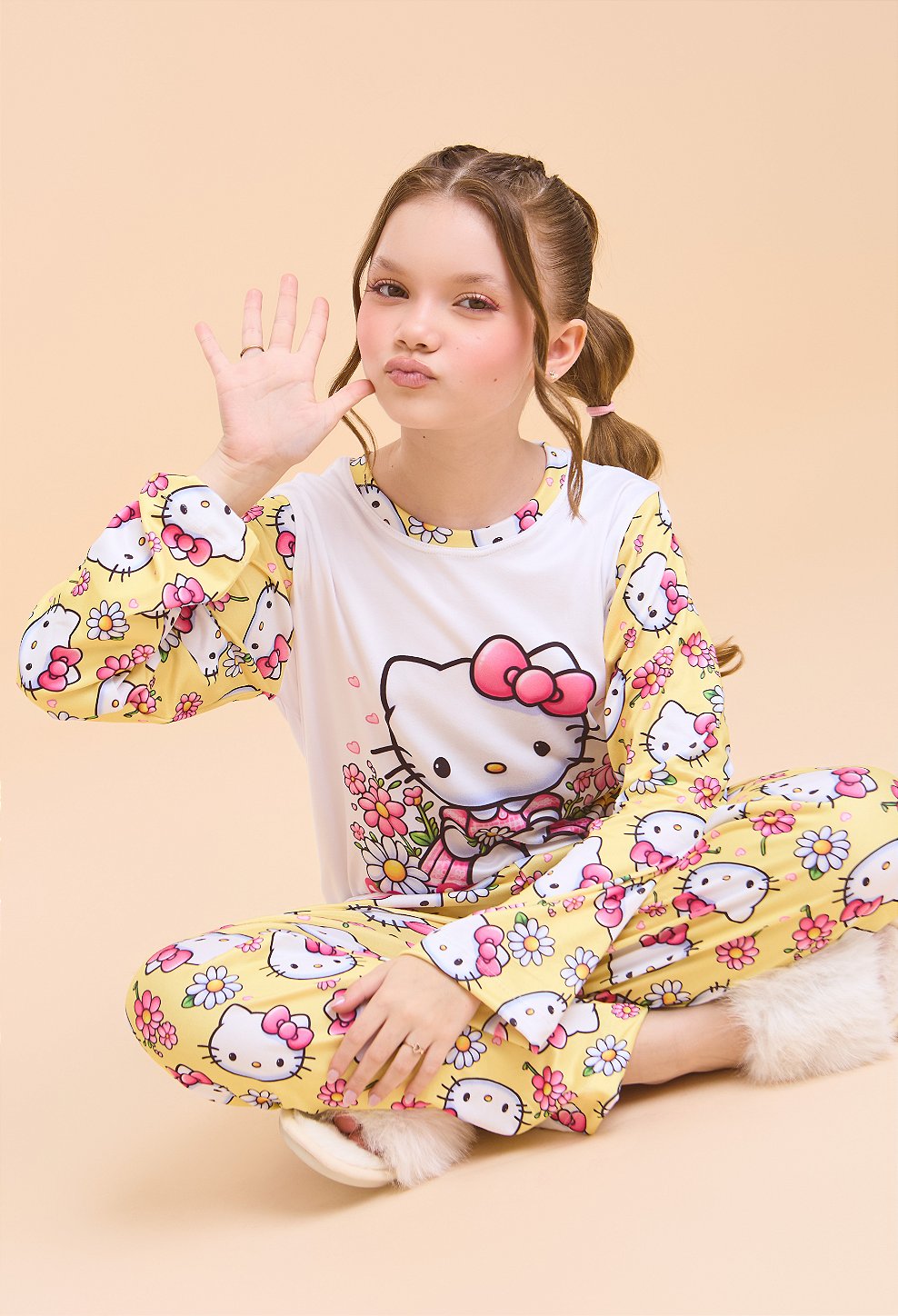 O pijama é composto por camiseta com mangas e detalhes estampados da Hello Kitty, e calça estampada plena em amarelo, proporcionando um visual alegre e delicado. Indicado para meninas que querem conforto extra nas noites frias, com um toque divertido de personagem infantil.